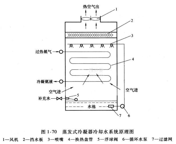 水循環系統如圖1-70所示,蒸發式冷凝器主要有換熱盤管、冷卻水循環系統及風機三個部分組成。該設備自帶的冷卻水循環系統由擋水板、噴嘴、循環水泵、過濾網、水池、浮球閥組成。水池中的冷卻水用循環水泵送至噴淋管,經噴嘴噴淋在換熱盤管的外表面上形成一層水膜。水受熱后一部分變成蒸汽由空氣帶走,未蒸發的噴淋水落入下面的水池中,經水泵再送至噴嘴循環使用。水池中有浮球閥調節補充水量,使之保持一定的水位。