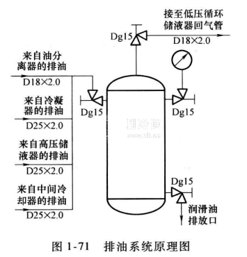 圖1-71所示為制冷系統中高壓側設備共用的潤滑油排放系統(排油系統),來自油分離器、冷凝器、高壓儲液器和中間冷卻器的潤滑油通過放油管道,進入集油器,定期打開排油直角式截止閥,排放系統的潤滑油。排油后,打開集油器頂部的直角式截止閥,把集油器中氨氣抽回低壓循環儲液器。