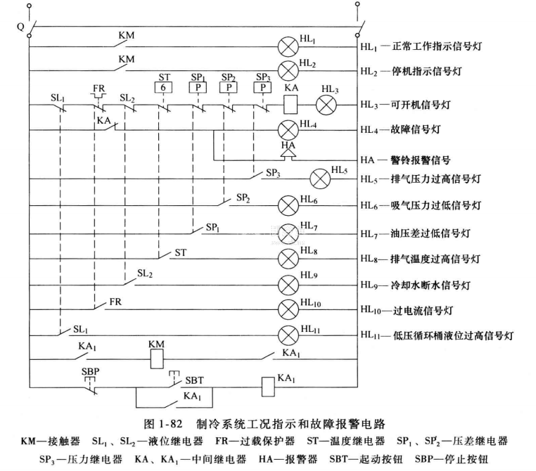合上電源總開關(guān)Q,停機(jī)信號燈HL2亮,當(dāng)各項參數(shù)都正常時,中間繼電器KA得電后常開觸點吸合,使開機(jī)信一號燈H L3亮。按下起動按鈕SBT,中間繼電器KA1得電后吸合自鎖,主電路控制接觸器KM得電吸合,其常開觸點閉合,工作信號燈HL1亮,KM的常閉觸點斷開,停機(jī)信號燈H L2滅。當(dāng)任何一項參數(shù)達(dá)到危險值時,中間繼電器KA失電釋放,可開機(jī)信號燈HL4滅,故障信號燈HL4亮,同時警鈴報警,相應(yīng)的指示信號燈亮,KM線圈失電,壓縮機(jī)停機(jī)。