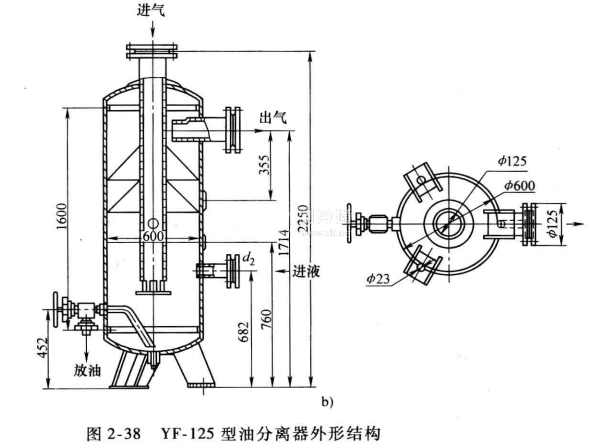 在進(jìn)氣管的外側(cè)上部還裝有多孔傘形擋板,起到分離液滴之用。筒體下部側(cè)面設(shè)有放油管接頭,與集油器相連。傘形擋板之上的筒體側(cè)面設(shè)有出氣管接頭,并使出氣管伸入筒內(nèi)一定的長度,且引出口是朝上開的,其目的是使氨氣在排出分離器以前再折流一次,有助于提高分離效果。直立圓筒形筒體和上、下兩個橢圓形封頭焊成一體,上封頭中心伸入一支進(jìn)氣管直至筒體下部,并浸在液氨液面以下,開口處有一擋板,防止氣流直沖器底,而由徑向開口流出,經(jīng)液氨洗滌后,較純凈的氨氣向上流,經(jīng)多孔擋板又一次接觸分離之后,由筒體上部的側(cè)向出氣管排出。在筒體中部有供液氨接管,底部有放油閥。