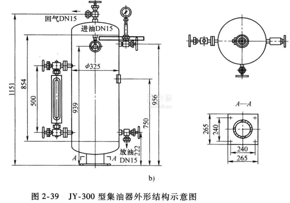 集油器是用鋼板焊制的立式圓柱形容器,其頂部設有抽氣管接頭,用于回收氨氣的出口和降低筒內的壓力,如圖2-39所示。筒體上側設有進油管接頭,它與其他容器的放油竹相連接,各容器中的油由此進入集油器。筒體的下側設有放油管,以便在氨回收后將油從筒內放出。此外,為了便于操作管理,在殼體上還裝有壓力表和玻璃液面指示器,通常集油器的進油量不宜超過其容積的70%。在放油前,為了加速油中氨液的蒸發,更好地回收制冷劑,常采取在集油器頂部用水淋澆加熱的措施。放油時只允許各設備逐一進行,避免壓力不同的設備互相串通。