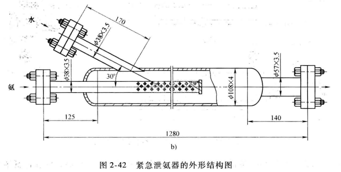 緊急泄氨器由直徑不同的兩支無縫鋼管套在一起后焊接而成。伸入大直徑殼體內的小直徑無縫鋼管側面開有許多出液小孔,殼體側面有一水管接入殼體,當緊急排氨時,側向水管噴入大量水,將由出液小孔噴出的液氨溶解于水,溶液則由出口放至下水道內。緊急泄氨器的結構及外形尺寸如圖2-42所示。