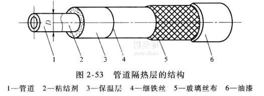 在制冷系統(tǒng)質(zhì)量檢查合格后,應(yīng)對(duì)制冷系統(tǒng)管道進(jìn)行涂裝、隔熱、防潮、保護(hù),以及顏色標(biāo)識(shí)處理。管道隔熱施工應(yīng)在制冷系統(tǒng)進(jìn)行氣密性試驗(yàn)、抽真空試驗(yàn)和充入制冷劑檢漏全部合格之后再進(jìn)行,隔熱層的厚度不應(yīng)超過(guò)設(shè)計(jì)厚度的10%,并在室溫條件下表面不會(huì)出現(xiàn)結(jié)露或結(jié)霜現(xiàn)象。管道隔熱層由以下幾個(gè)部分構(gòu)成,如圖2-53所示。