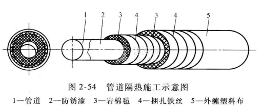 2)室內大管道( D350無縫鋼管)的隔熱做法。將巖棉氈卷材剪成200~300mm寬的帶,以螺旋方式纏繞在管道上,邊纏邊壓邊包扎,采用鋼絲包扎的間距為300mm,直至第一層包扎完畢。第二層巖棉氈的包扎做法同第一層。防潮層采用聚乙烯塑料布包纏,敷設平整,搭接寬度為40mm,搭口用粘結劑貼牢,外面用鋼絲捆扎。