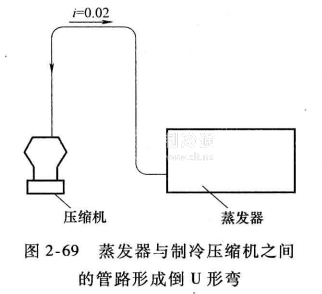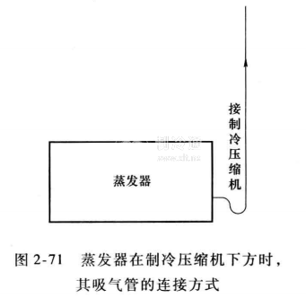 2)蒸發(fā)器和制冷壓縮機(jī)布置在同一水平位投時(shí),吸氣管布置應(yīng)如圖2-69所示,使蒸發(fā)器與制冷壓縮機(jī)之間的管路形成倒U形彎,防止停機(jī)后液體制冷劑進(jìn)入制冷壓縮機(jī)內(nèi)。