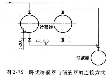 (2)蒸發(fā)式冷凝器至儲(chǔ)液器的液體管道 單組冷卻排管的蒸發(fā)式冷凝器,可用液體管本身進(jìn)行均壓。冷凝液體的流速不應(yīng)超過0. 5m/s,水平管段的坡度為1/50,坡向儲(chǔ)液器。