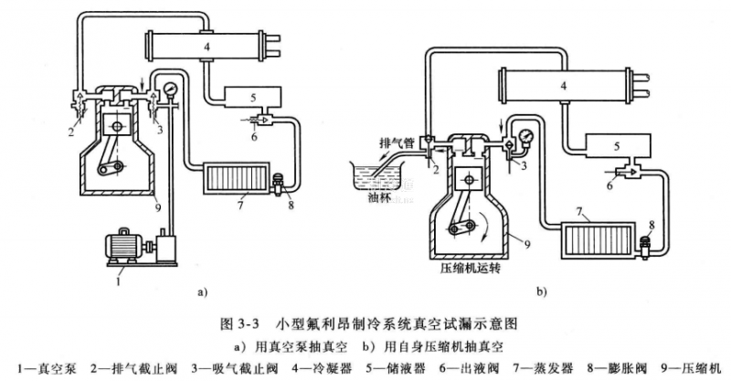 系統抽真空可用真空泵進行,如無真空泵時,可用自身制冷壓縮機代替。對于較大的制冷系統通常用自身抽真空試驗法。