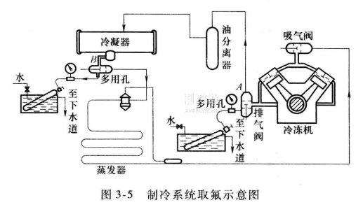 1)將氟壓縮機排氣閥和冷凝器出液閥開足,此時氟截止閥A和B處多用孔即被關閉。取下堵頭,依照圖3-5接好取氟管。