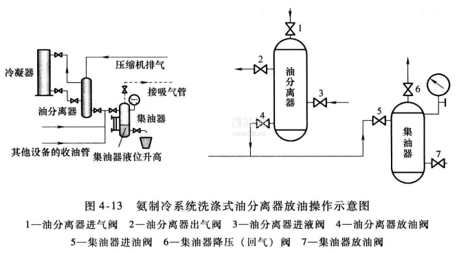 氨制冷系統洗滌式油分離器的放油操作,如圖4-13所示。在實施制冷系統的放油操作前,必須做好充分的準備工作:明確各設備的放油順序,仔細檢查制冷設備的各閥門能否正常關啟,并可靠地關閉各設備的放油閥,以防閥門關閉不嚴或操作失誤。放油操作時,操作人員應戴上護目鏡和橡膠手套,站在放油管出口的側面工作,并有人可靠地監護。放油過程中不得離開操作地點。放油完畢后,應記錄放油的時間和放出油的數量。