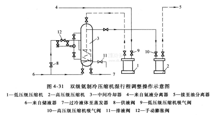 首先應(yīng)準(zhǔn)確判斷是低壓級壓縮機(jī)發(fā)生濕行程,還是高壓級壓縮機(jī)發(fā)生濕行程,然后再作相應(yīng)的調(diào)整。雙級氨制冷壓縮機(jī)濕行程的調(diào)整操作如圖4-31所示。