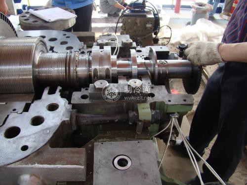 在拆制冷壓縮機的后主軸承座之前,應(yīng)先將曲柄銷用布包好,以防碰傷,再用方木在曲軸箱內(nèi)把曲軸墊好。分別將前后軸承座連接的油管拆掉,然后擰下后軸承座周圍的螺母,將兩根專用螺栓(M12)擰進后軸承座的螺孔內(nèi),把軸承座均勻地頂開,慢慢地將軸承座取出,注意不要損傷軸承座的密封平面。