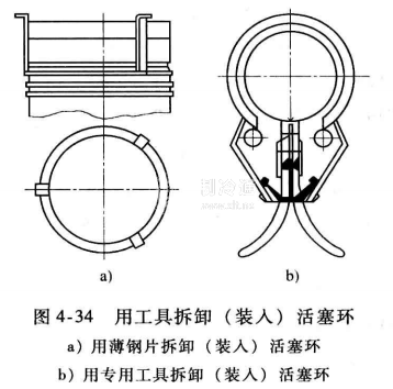 3)用專用工具拆卸活塞環(huán),如圖4-34b所示。