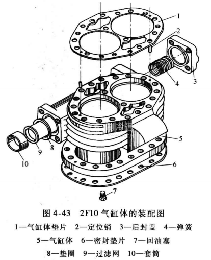 2F10制冷壓縮機的機體,由氣缸體和曲軸箱上、下兩部分組成,沒有卸載機構,其氣缸體安裝方法如圖4-43所示。