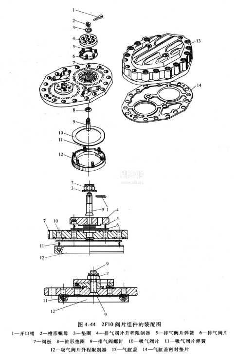1) 2F10閥片組件的裝配順序,如圖4-44所示。