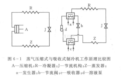 圖6一1示出吸收式制冷機與壓縮式制冷機工作原理比較。由圖可見,它們的共同點是高壓制冷劑蒸氣在冷凝器中冷凝成液體,然后經節流機構節流,降壓后進入蒸發器,在低壓下液體制冷劑汽化,達到制冷的目的。因此它們都具有冷凝器、節流閥和蒸發器;不同點在于將低壓蒸氣變為高壓蒸氣時所采用的方式不同,壓縮式制冷機通過原動機帶動壓縮機完成,而吸收式制冷機則是通過發生器、節流閥、吸收器和溶液泵完成。