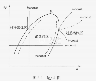 制冷循環(huán)Igp-h圖即壓焓圖,如圖3-1所示,它以壓力為縱坐標(biāo),以比熔為橫坐標(biāo)。為了縮小圖的尺寸,提高圖的精度,壓力坐標(biāo)取為對(duì)數(shù)坐標(biāo),因而坐標(biāo)系為單對(duì)數(shù)坐標(biāo)系。