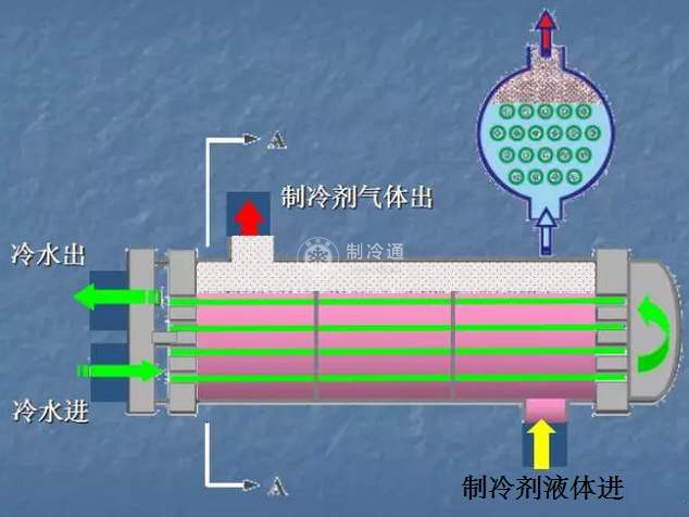 ④對于殼管式蒸發(fā)器,如果用水作為載冷劑,因水在殼側,熱容量大,而且水能充分混合,因此不易出現(xiàn)水的凍結現(xiàn)象;