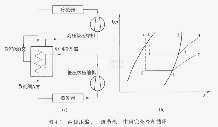 中間完全冷卻是指將低壓級壓縮機的排氣,冷卻成飽和蒸汽,即高壓級壓縮機吸入中間壓力下的飽和蒸汽。