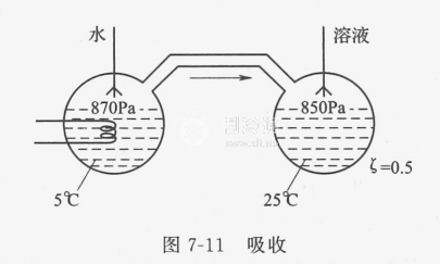 溴化鋰吸收式制冷的理論循環(huán)如圖7-11所示,有兩個(gè)中間相通容器,一個(gè)放有溫度為5℃的水,相應(yīng)的飽和蒸汽壓力為0. 87kPa;另一個(gè)放有溫度為25℃,濃度為50%的溴化鋰水溶液,相應(yīng)的蒸汽壓力為0. 85kPa;則蒸汽和溶液未處于平衡,水蒸氣向溴化鋰水溶液遷移,直至達(dá)到平衡。水在5℃下蒸發(fā),就能從溫度高于5℃的被冷卻介質(zhì)中吸取氣化潛熱,使被冷卻介質(zhì)冷卻。達(dá)到平衡后,吸收不能繼續(xù)進(jìn)行,水也不再蒸發(fā)。