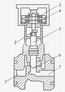 減速型電子膨脹閥的結構如圖12-26所示,它由閥體、脈沖步進電機、波紋管、傳動機構和閥芯等組成。脈沖步進電機通過傳動機構帶動閥芯上、下移動,進行制冷劑流量調節。