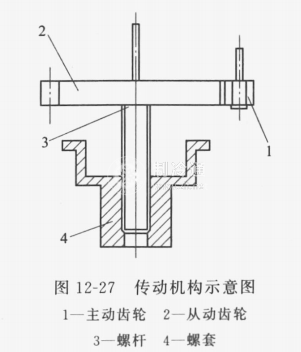 傳動機構包括齒輪副和螺紋副,如圖12-27所示。小齒輪為主動齒輪,由脈沖步進電機帶動,小齒輪帶動大齒輪將轉速降低。傳動螺桿與大齒輪為一體,隨大齒輪旋轉。由于螺套與閥體上防自轉機構的作用,螺套無旋轉運動。隨著螺桿的旋轉,螺套上升或下降,將圓周運動變換成直線運動,并帶動閥芯上下移動。
