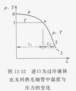 對于進入的制冷劑是過冷液體、無回熱毛細管的絕熱膨脹過程,溫度與壓力隨過程進行的變化關系如圖12-32所示。圖中0-a為第一段,即液體段;a-z為第二段,即兩相段。在第一段中,由于摩擦的作用,液體的壓力不斷降低,而比體積變化不大,制冷劑流速基本不變,因而熔值基本不變,使得溫度也基本保持不變(但不是嚴格的溫度恒定)。隨著壓力的降低,液體的過冷度不斷減小,直至成為飽和液體,進入第二段。