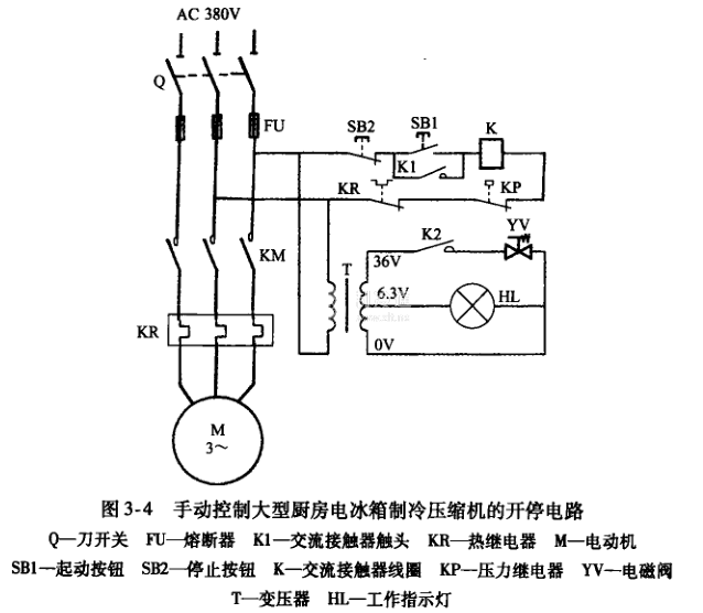 手動(dòng)控制大型廚房電冰箱制冷壓縮機(jī)的開(kāi)停電路是控制電路中基本的電路,其典型電路如圖3-4所示。