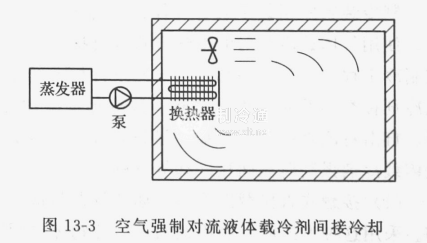 空氣強制對流液體載冷劑間接冷卻 如蒸發器設于被冷卻空間外部,蒸發器冷卻液體載冷劑,依靠泵將載冷劑送入被冷卻空間,在被冷卻空間內另設一個換熱器,載冷劑在其中與被冷卻空間的空氣換熱,空氣依靠風機強制對流,則稱空氣強制對流液體載冷劑間接冷卻,如圖13-3所示,采用這種方式時,主要熱阻有制冷劑蒸發對流換熱熱阻、蒸發器管內側污垢熱阻、傳熱壁面導熱熱阻、管外側污垢熱阻、蒸發器中載冷劑的強制對流換熱熱阻、被冷卻空間內換熱器中載冷劑的強制對流換熱熱阻、被冷卻空間內換熱器傳熱壁面導熱熱阻、被冷卻空間內換熱器中空氣的強制對流換熱熱阻、空氣與被冷卻物體之間的強制對流換熱熱阻等,總熱阻主要取決于兩項空氣強制對流換熱熱阻。