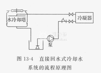 直接回水式 如冷卻水由冷凝器依靠水的壓力推動(dòng)直接流至水冷卻塔,則系統(tǒng)為直接回水式。圖13-4為直接回水式冷卻水系統(tǒng)的流程原理圖。