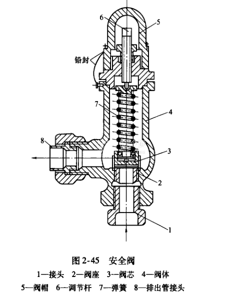 為防止制冷系統(tǒng)高壓壓力超過(guò)限定值而造成管道爆裂,需在制冷系統(tǒng)的管道上設(shè)置安全閥。這樣,當(dāng)系統(tǒng)中的高壓壓力超過(guò)限定值時(shí),安全閥自動(dòng)啟動(dòng),將制冷劑泄放至低壓系統(tǒng)或排至大氣。圖2-45所示為一種制冷系統(tǒng)常用的安全閥。