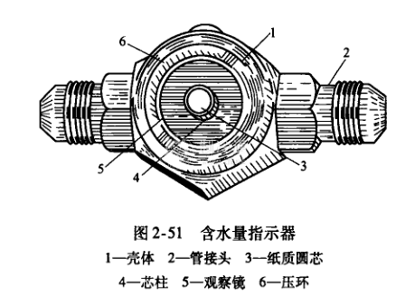 流液指示器指示制冷劑中含水量變化的原理是:在液流指示器中裝有一個指示含水量的紙質(zhì)圓芯,在圓芯上涂有金屬鹽指示劑,含水量不同時,其指示劑顯示的顏色會不同。
