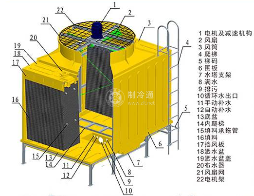 按通風的動力,水冷卻塔可分為自然通風冷卻塔和機械通風冷卻塔;按空氣與水的流動方式,水冷卻塔分為橫流式和逆流式;按結構材料,水冷卻塔分為混凝土冷卻塔和玻璃鋼冷卻塔等。目前使用的水冷卻塔是玻璃鋼制吸風式逆流冷卻塔,如圖所示。