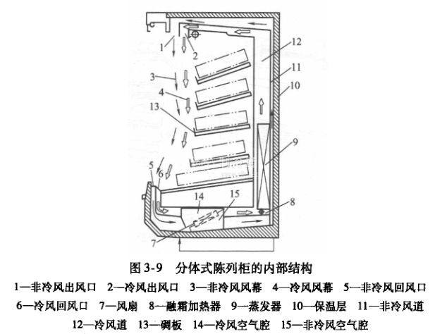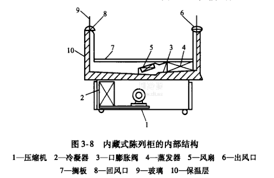 陳列柜較具代表性的是內藏式陳列柜和分體式陳列柜。內藏式陳列柜的內部結構如圖3-8所示,分體式陳列柜的內部結構如圖3-9所示。