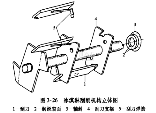 具有預冷缸的冰淇淋機則需引導制冷劑液體流經預冷缸外壁蒸發。攪拌作用使一部分空氣進入冰淇淋,二氧化碳和空氣的膨脹作用有利于冰淇淋的擠出過程。刮刀清洗之后,必須放歸原處,刮刀之間不可互換,否則不利于冰淇淋機的穩定運行。圖3-26所示為刮削機構的立體圖。刮削機構由刮刀和刮刀支架及驅動軸組成,并作成可拆式的,以便清洗。整個機構安裝在冷凍缸內,由電動機通過帶輪傳動,旋轉速度通常為100r/min左右。