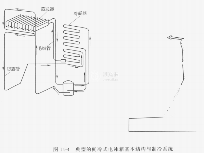 間冷式電冰箱無論是單門、雙門還是多門,其制冷系統基本相同,都是采用一個翅片管式蒸發器,通過風機強制吹風,使空氣流過蒸發器進行冷卻,并使箱內空氣循環并冷卻被冷卻物品。