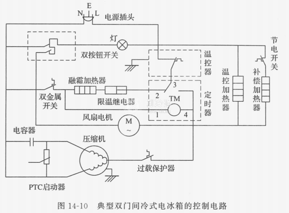 典型雙門間冷式電冰箱的控制電路如圖14-10所示,由壓縮機電機、啟動繼電器、過載保護器、風扇電機、內扇外殼加熱器、溫控器、化霖定時器、雙金屬開關(除箱溫控器)、化霜加熱器、限溫熔斷器、箱內照明燈、門開關等器件組成。