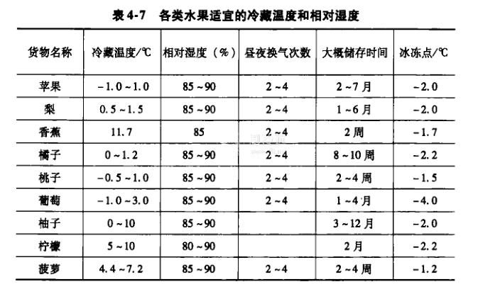 根據每種水果的不同特點,運送前應首先確定它們各自的冷藏溫度、濕度和儲存時間,見表4-7。
