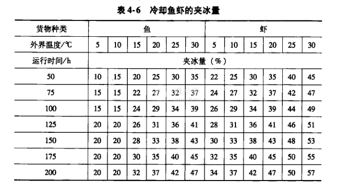 魚蝦類貨物的冷卻運輸一般都采用在包裝內(nèi)夾碎冰等進行冷卻的方法。因此,確定魚包內(nèi)的加冰量是至關(guān)重要的問題,應(yīng)在包裝魚蝦時,根據(jù)魚蝦的新鮮度、外溫、運輸距離、包裝類型等條件合理確定魚包的夾冰數(shù)量,總的要求是魚蝦在整個運輸?shù)倪^程中不脫冰。不同外溫和運輸時間下的夾冰量見表4-6。