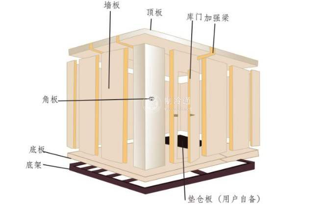 小型裝配式冷庫均為室內用裝配式冷庫。其庫容較小,通常采用自承重結構。此時,隔熱板就是承重結構,無需另加支承件。室內用裝配式冷庫的地板、墻板和頂板都用隔熱板組成,其墻側板、墻角板、頂邊板、頂中板、底邊板和底側板均為系列產品,安裝時進行積木式組合即可。