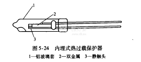 全封閉式壓縮機(jī)內(nèi)埋式熱過(guò)載保護(hù)器,其結(jié)構(gòu)如圖5-24所示。它是裝在壓縮機(jī)電動(dòng)機(jī)的繞組中,直接感受繞組溫度變化的。當(dāng)繞組因某種故障原因溫升超過(guò)允許范圍時(shí),內(nèi)埋式熱過(guò)載保護(hù)器內(nèi)的雙金屬片產(chǎn)生變形,斷開觸頭,切斷壓縮機(jī)電源。