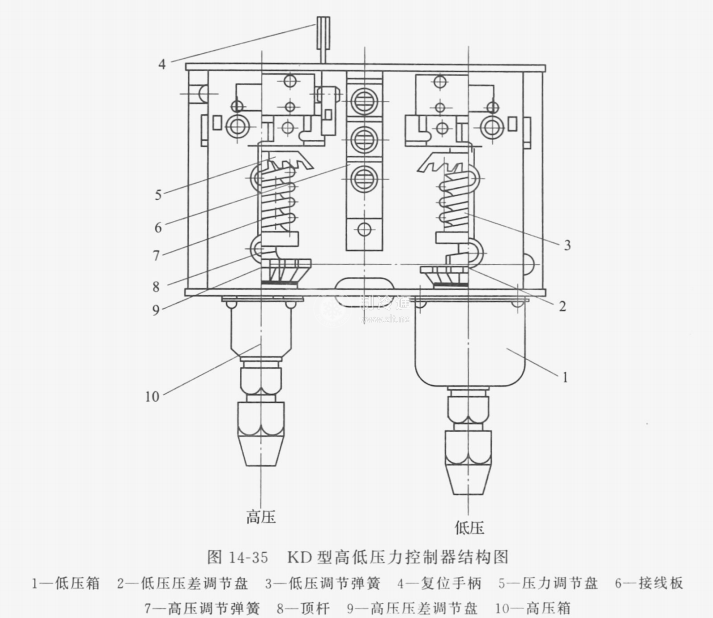 圖14-35為KD型高低壓控制器的內部結構,繼電器的高低壓接管分別與壓縮機的排氣閥和吸氣閥上的旁通孔(或閥)連接,接受排氣壓力和吸氣壓力信號,它的電器線路接入壓縮機電機的控制線路,這樣壓力繼電器就能根據接受到的吸、排氣壓力,直接控制壓縮機的開停。