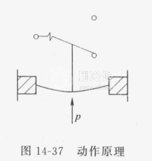 在封閉式制冷系統中,可采用固定式壓力控制器,其優點是結構簡單、工可靠、無制冷劑泄漏點。當系統中制冷劑的壓力上升到設計動作壓力Pm時,球冠形膜片產生失穩跳躍反轉,推動電氣開關動作,見圖14-37;當壓力下降到恢復壓力Pt時,在彈性力的作用下,膜片跳躍恢復。固定式壓力控制器可用作高壓保護、低壓保護、制冷劑泄漏保護和壓力控制器件。
