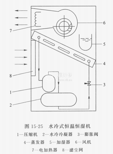 水冷式恒溫恒濕機的工作原理如圖15-25所示,其制冷系統較簡單,由壓縮機、水冷冷凝器、蒸發器、膨脹閥等機器設備組成。