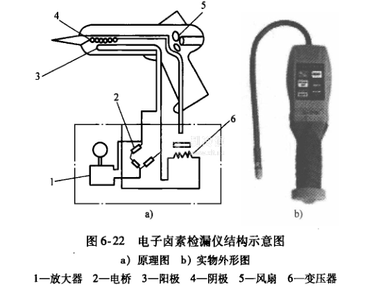 電子鹵素檢漏儀的結(jié)構(gòu)如圖6-22所示。用鉑絲作陰極、鉑罩作陽(yáng)極構(gòu)成一個(gè)電場(chǎng),通電后鉑絲達(dá)到熾熱狀態(tài),發(fā)射出電子和正離子,儀器的探頭(吸管)借助微型風(fēng)扇的作用,將探測(cè)處的空氣吸入,并通過(guò)電場(chǎng)。如果被吸入的空氣中含有鹵素(如R12、R22、R134等),與熾熱的鉑絲接觸即分解成鹵化氣體,電場(chǎng)中一旦出現(xiàn)鹵化氣體,鉑絲(陰極)的離子放射量就要迅猛增加,所形成的離子流隨著吸入空氣中的鹵素多少成比例地增減。因此,可根據(jù)離子電流的變化來(lái)確定泄漏量的多少。離子電流經(jīng)過(guò)放大并通過(guò)儀表顯示出量值,同時(shí)發(fā)出音響信號(hào)。