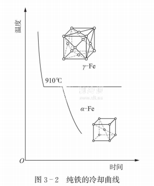 金屬的實(shí)際結(jié)晶溫度可以用熱分析法進(jìn)行測定.熱分析法大致的過程如下:將純金屬加熱熔化后,使其緩慢冷卻,在冷卻過程中,每隔一定時間測一次金屬的溫度,最后,根據(jù)測得的數(shù)據(jù),在坐標(biāo)圖上繪制溫度與時間關(guān)系的曲線,該曲線稱為冷卻曲線,如圖3-2所示為純鐵的冷卻曲線。