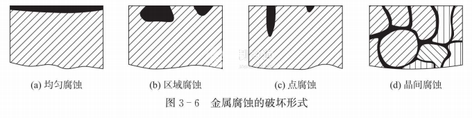 根據(jù)腐蝕的破壞形式,可分為均勻腐蝕與局部腐蝕,而局部腐蝕又可分為區(qū)域腐蝕、點(diǎn)腐蝕、晶間腐蝕、應(yīng)力腐蝕、電偶腐蝕等。各種腐蝕形式如圖3一6所示。