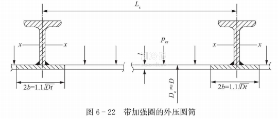 當外壓容器的壁厚不能滿足設計要求時,可采用增加容器壁厚及加設加強圈的辦法提高容器的許用設計外壓。增加壁厚會大大提高制造成本,因此,工程中常采用加設加強圈的辦法,即在筒體的外部和內部相隔一定的距離焊接用型鋼做的加強圈,如圖6-22所示,常見的加強圈有扁鋼,T型鋼、工字型鋼、角鋼等。