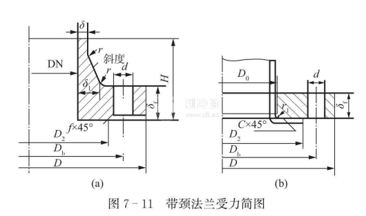 強(qiáng)度尺寸包括法蘭有效厚度δf、法蘭頸部高度h、法蘭頸部小端和大端有效厚度δ0及δ1等。其中主要是法蘭的有效厚度δf。這是與操作條件、法蘭形式和材料強(qiáng)度有關(guān)的一個(gè)基本尺寸,應(yīng)由計(jì)算確定。標(biāo)準(zhǔn)中所給的數(shù)據(jù)是經(jīng)標(biāo)準(zhǔn)化圓整后的強(qiáng)度計(jì)算值。