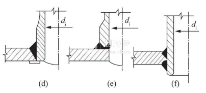 接管在殼體上的放置方式可分為平置式[圖7一14(e)]、平齊插入式[圖7一14(d)〕和內伸插入式「圖7一14(f)]。試驗結果表明,完全焊透的內伸插入式結構最佳。未焊透的內伸插入式疲勞壽命雖然較完全焊透短,但制造方便且壽命比平齊插入管要長。這兩種類型的接管在國外原子能壓力容器上均已采用,焊接質量高以及轉角焊縫經過打磨圓滑,抗疲勞效果更好。試驗還發現,焊縫經磨削的平齊插入式接管,疲勞裂紋起于接管內壁下角;內伸插入式接管則起于接管內壁與殼體交接面處的中部。或在角焊縫與母材的邊界上。如條件許可,采用插入接管的形式補強效果較為有利。