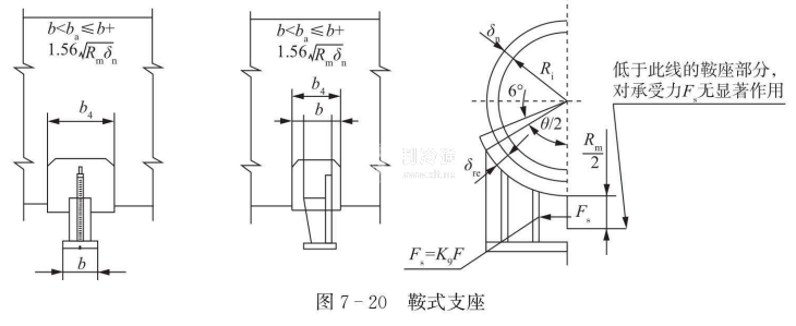 壓力容器作用于鞍座的載荷,在鞍座板上的分布如圖7一20所示。此載荷的水平分量將使鞍座兩邊角分開,因此鞍座必須有足夠厚度,以保證邊角的剛性。